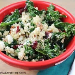 - Place kale in a large mixing bowl. Whisk olive oil, lemon juice, Dijon mustard, garlic, pepper and salt together in a small bowl. Drizzle over kale. Stir and let sit for a few minutes. Add cooled quinoa, pecans, dried cranberries and feta cheese and toss to incorporate. ENJOY!!