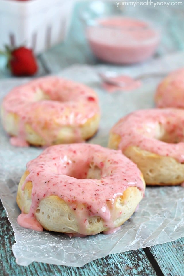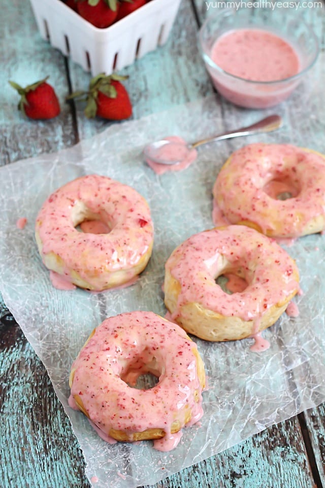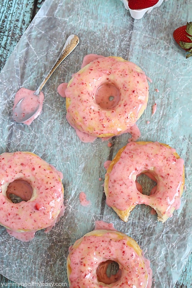 Baked Donuts made with refrigerated biscuits and drizzled with a delicious Strawberry Glaze (you’ll want to eat with a spoon!)