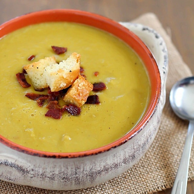 I decided to make mine in a dutch oven and puree it to finish it up. Can I just say – this turned out awesome! Such a crazy good soup. It’s full of bacon flavors, onion, carrot, garlic, seasonings and obviously split peas. 🙂 I pureed it in my blender and served with a topping of bacon (yay!) and homemade parmesan croutons. Love that crunch on top. Seriously so delicious. Tons of great flavors going on in this soup. My family loved it!