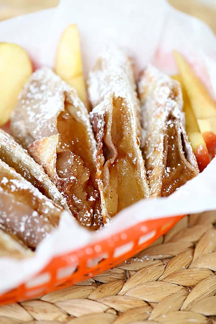 Think of the apple pie egg roll as a lumpia filled with apple pie filling. Only instead of throwing it in the deep fryer and using all that hot oil, you just fry it with the air fryer.