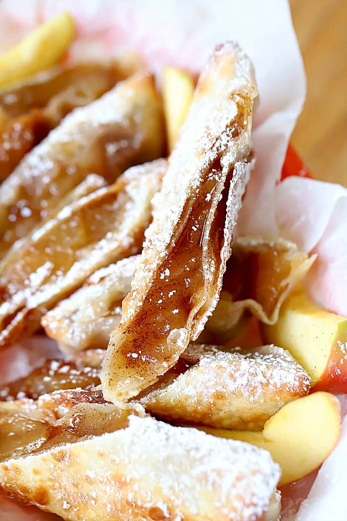 The result creates a light and fluffy crust filled with hot apple pie sweetness! Your typical egg roll wrapper is actually almost as thin as filo (phyllo) dough used for pastries like baklava or other puff pastries.