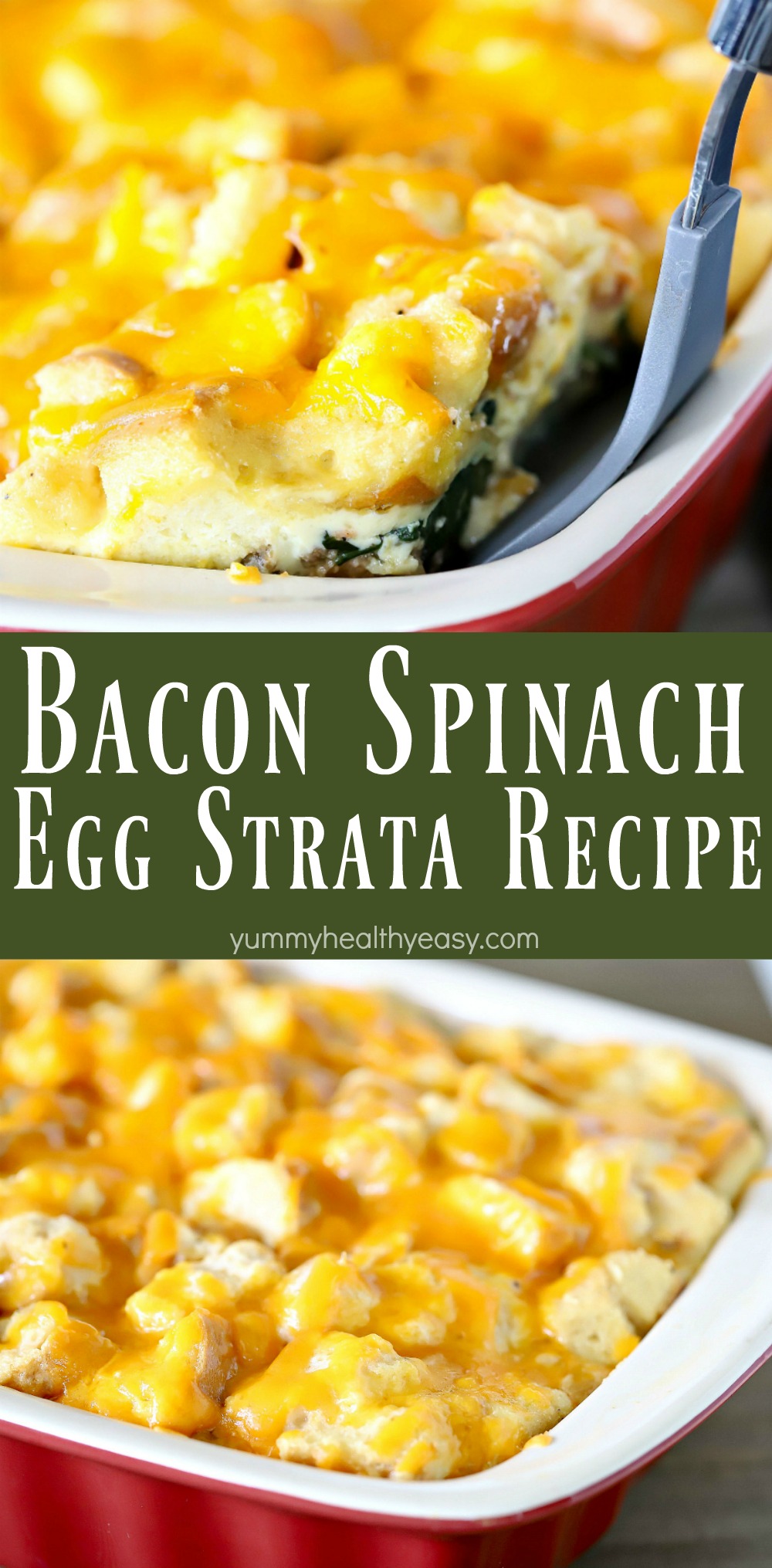 This egg strata recipe has a delicious egg & bread layer on the bottom and a layer of bacon, sausage, spinach & onion filling in the middle with another layer of bread and cheese on the top. This gorgeous casserole will impress your guests – whether it’s for brunch, lunch or breakfast for dinner!