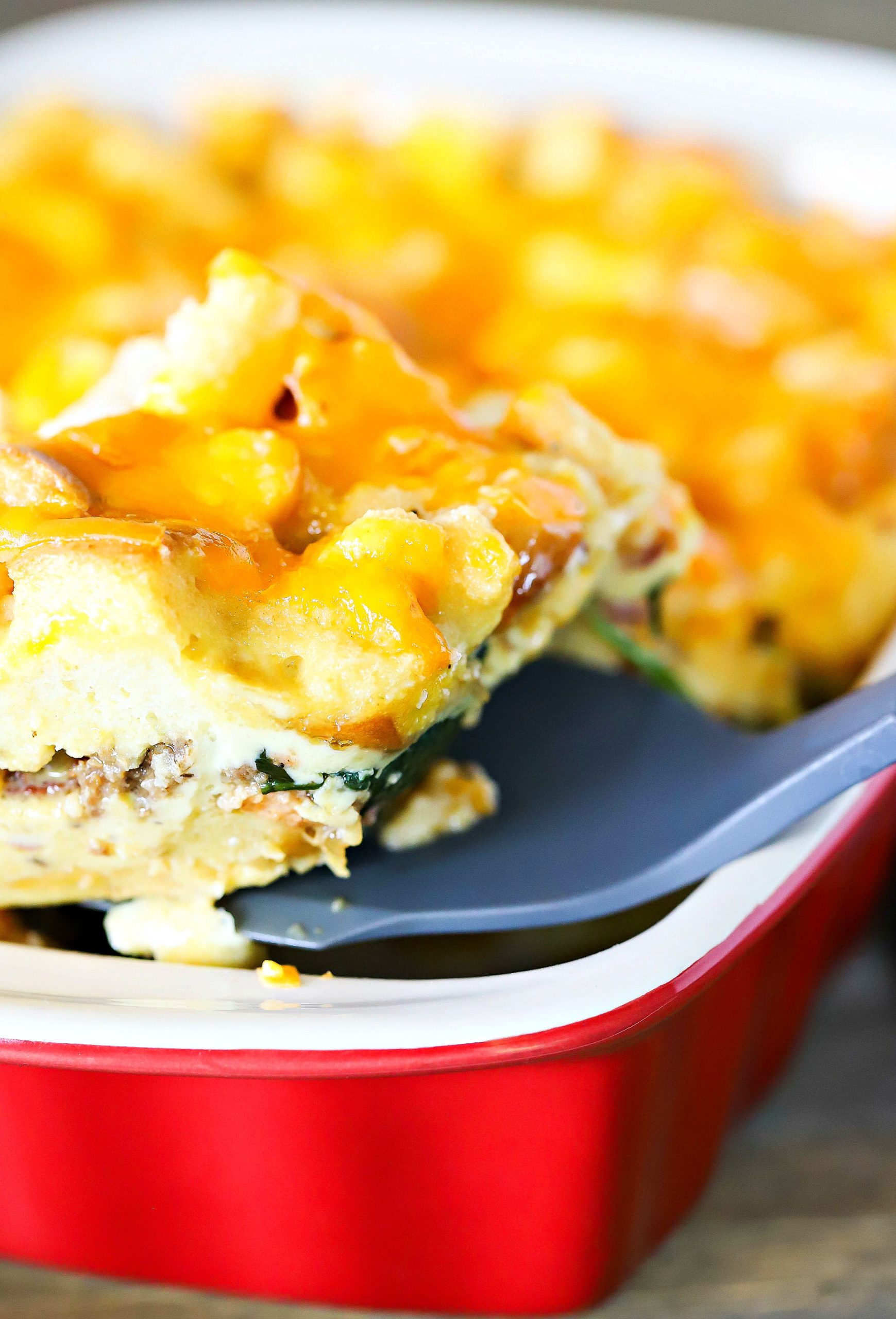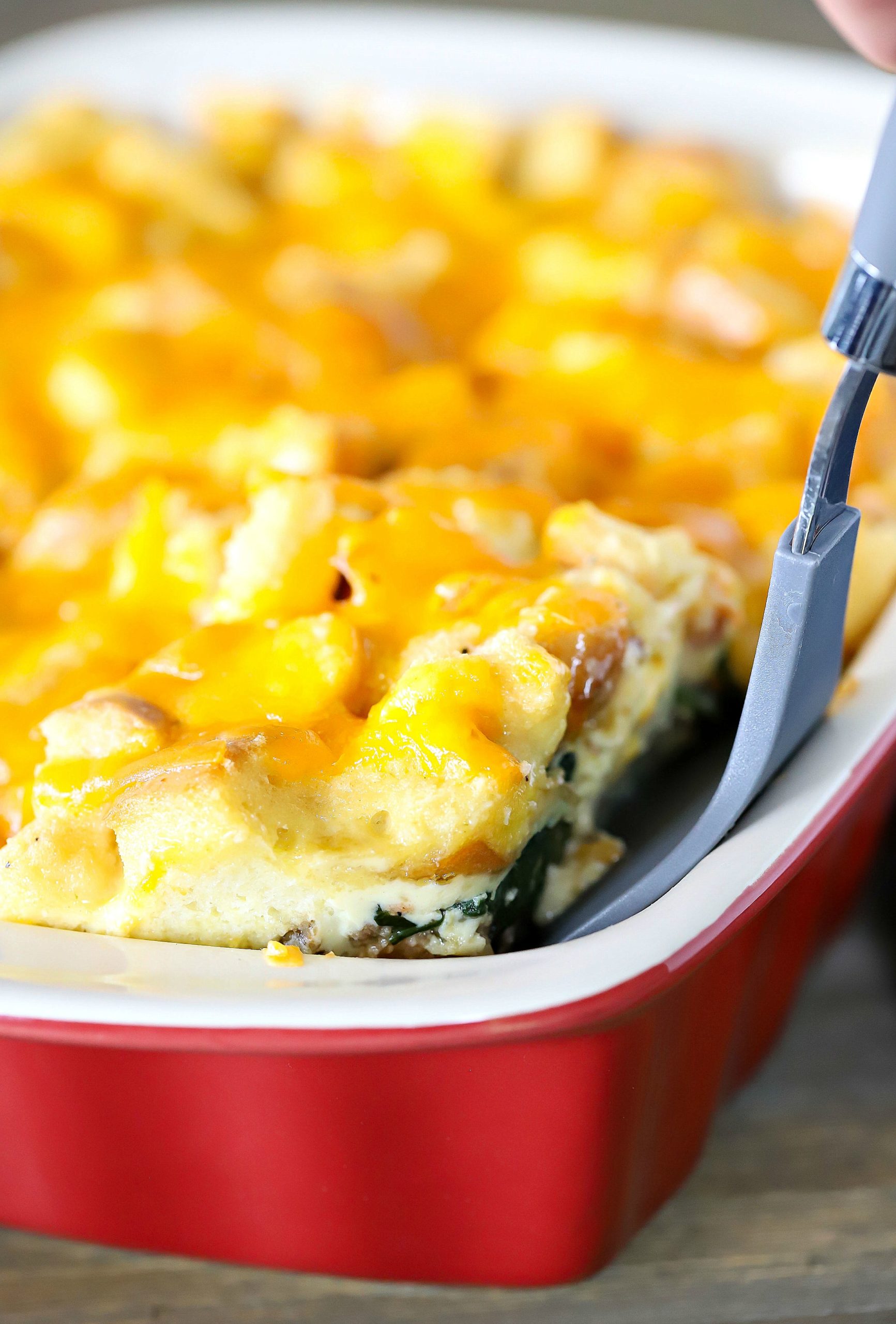 Honestly, an egg strata can soak for hours (overnight) or for just 30 minutes! I think the key is to use a loaf of bread that’s been somewhat dried out so the egg and milk mixture really soak into it and it doesn’t get too soggy. The layers of the strata really make the dish flavorful and tender.