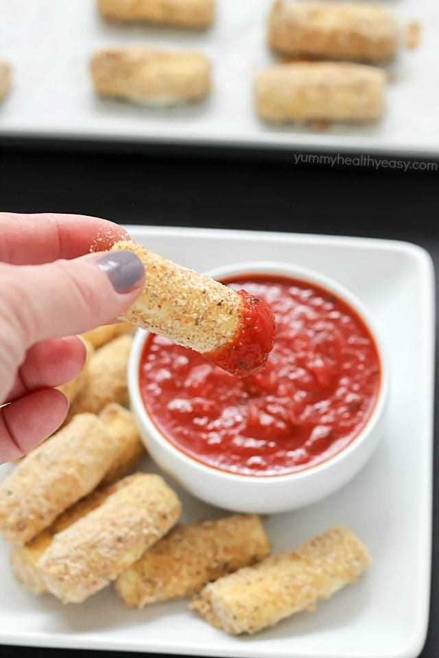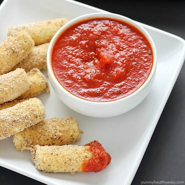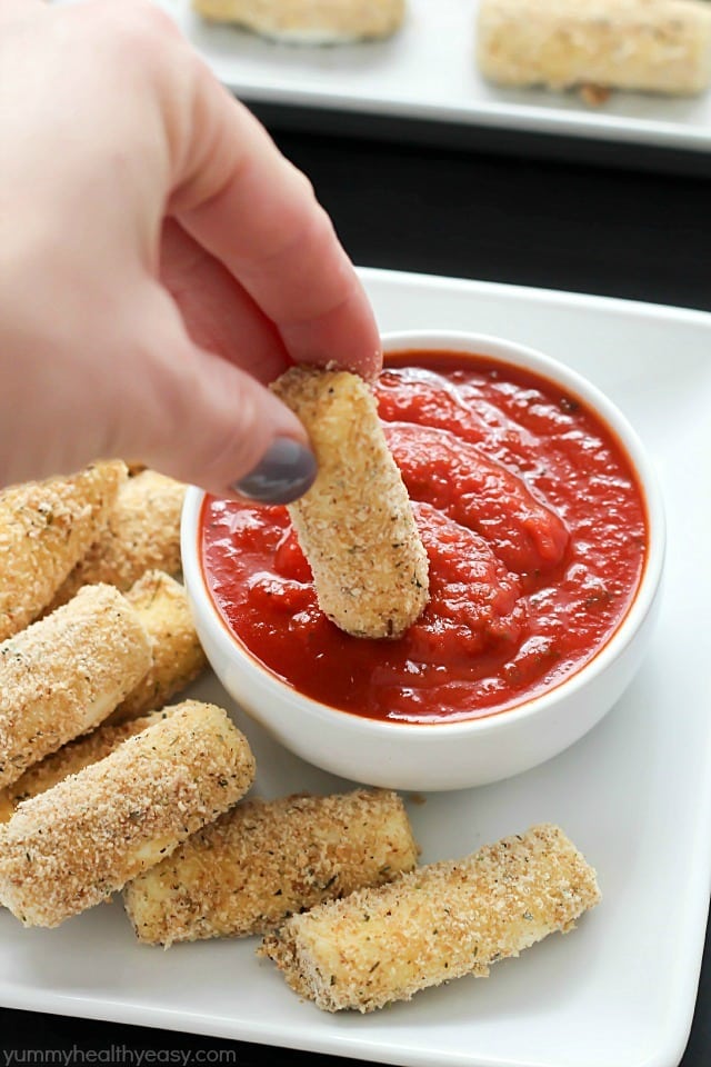 Baked mozzarella sticks for the win! You can’t go wrong with warm, gooey cheese dipped in marinara sauce, am I right?!