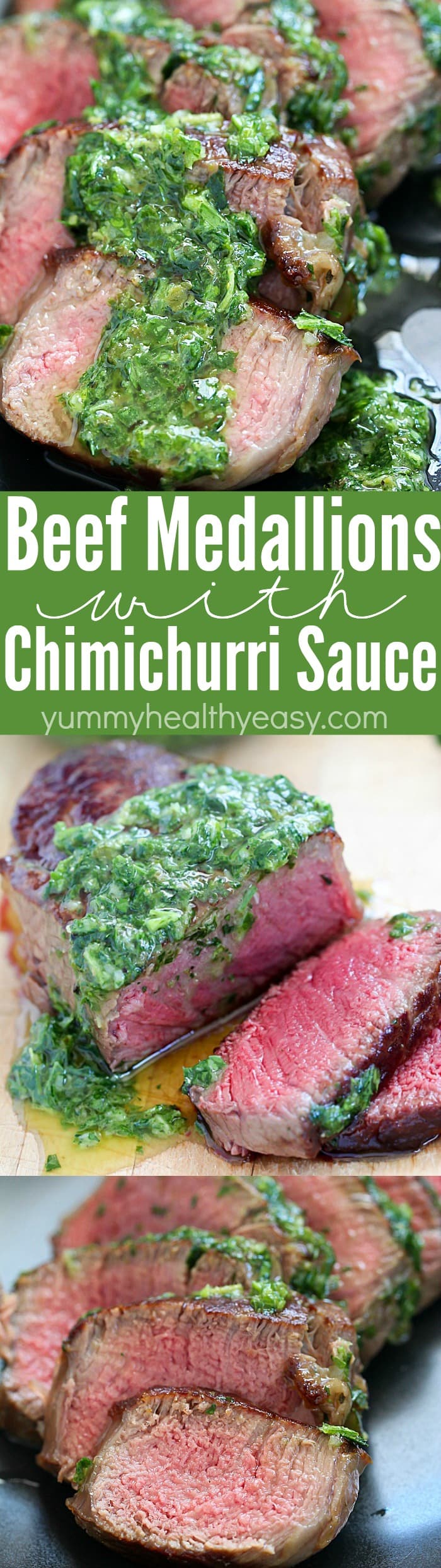 Tender Beef Medallions cooked to perfection and served with a flavorful Chimichurri Sauce! A quick and easy dinner recipe made in under 30 minutes (but looks fancy)!