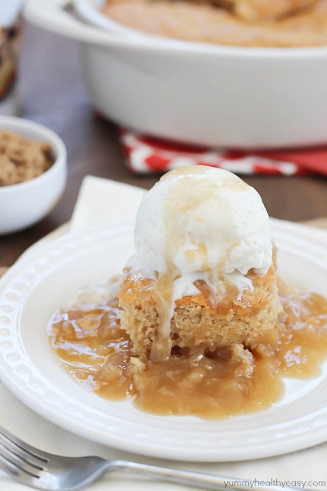 In a nutshell, it’s a layer of moist, butterscotch cake baked over a layer of warm caramel goodness. When served with a scoop of ice cream, you get the cake, the ice cream AND the caramel to pour over the top! It’s just crazy amazing. Oh, and only 4 main ingredients!