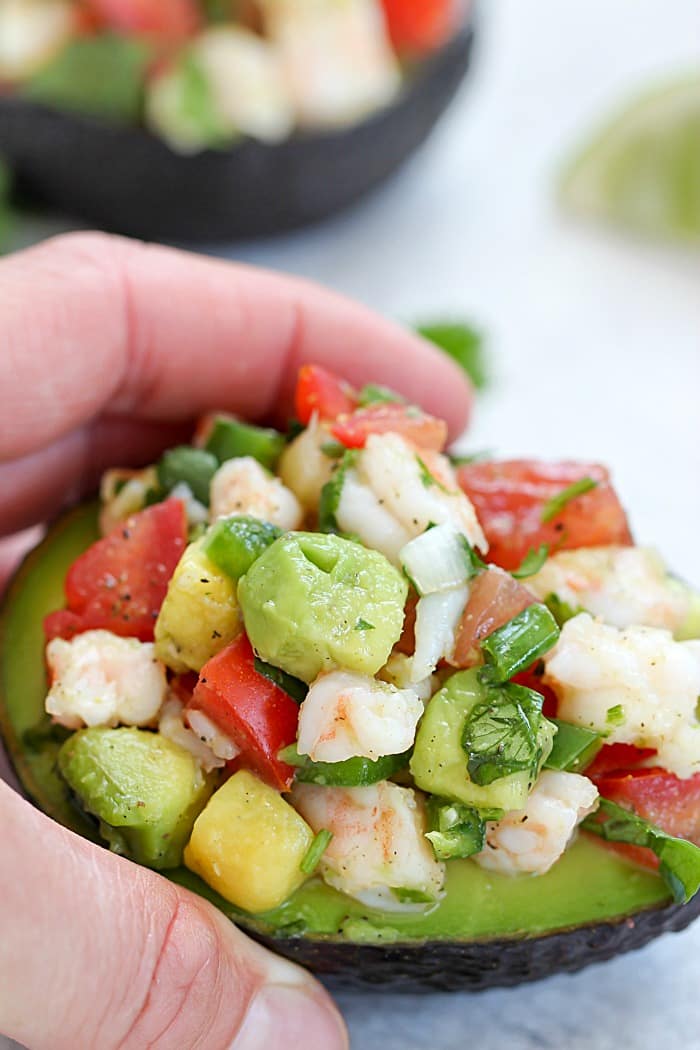 You will LOVE this Easy Avocado Shrimp Ceviche Recipe! It’s full of fresh and healthy ingredients and a touch of spice, all spooned into California Avocados, sponsored by the California Avocado Commission! It’s no surprise that avocados are one of the most popular item in the produce section. Especially here in California where I live. It’s a staple ingredient to many (and I mean many) of my dishes. I always have them on hand and my boys love them.