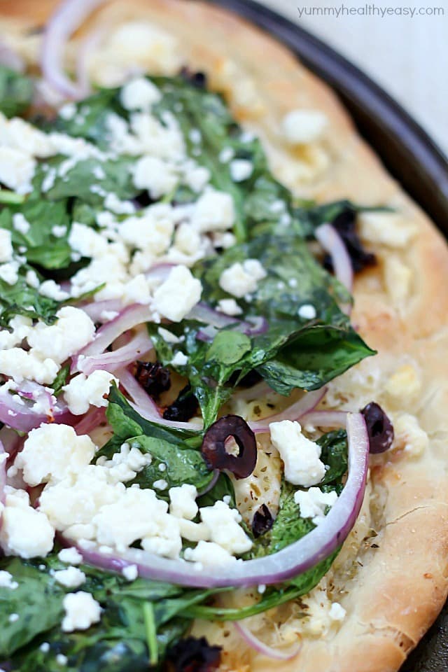 Easy Greek Pizza Recipe with a mayo & garlic spread and topped with feta, red onion, spinach, sun dried tomatoes and kalamata olives. Crazy delicious!