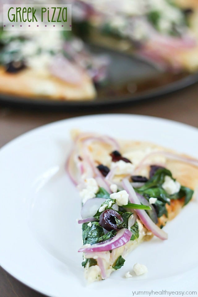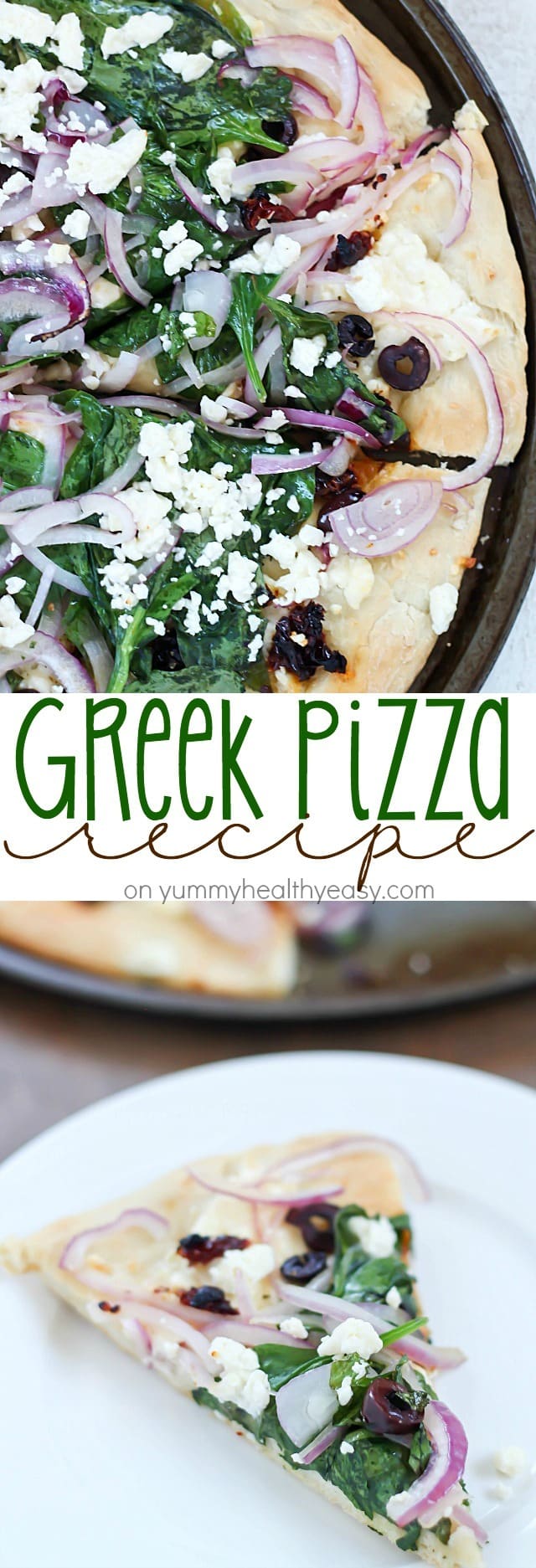This Greek Pizza Recipe is super easy and full of yummy Greek flavors. It makes a special dinner the whole family will enjoy!