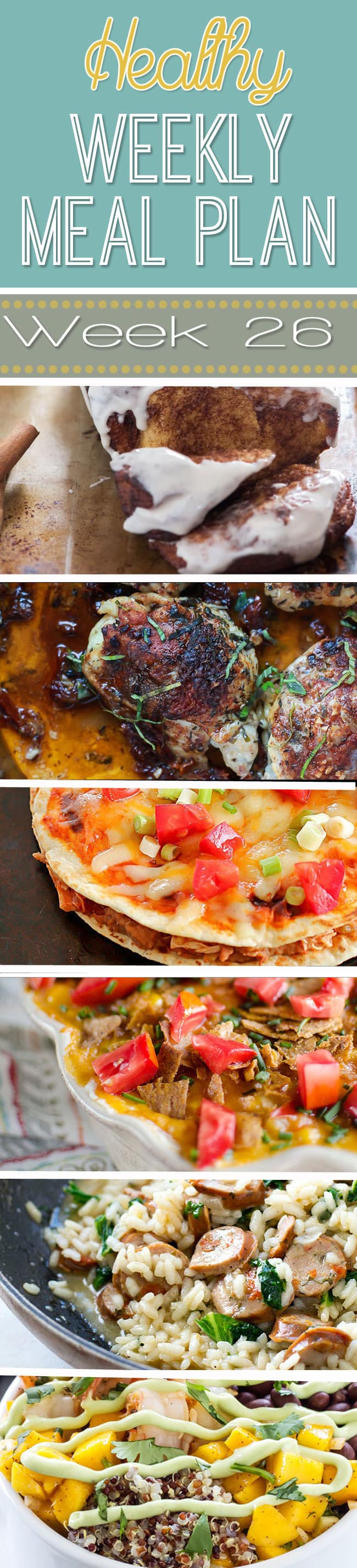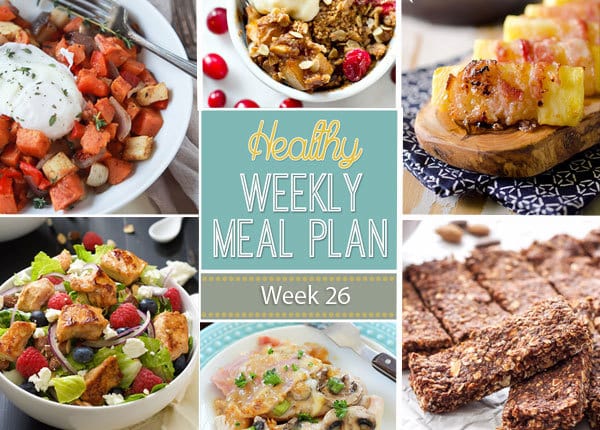 Healthy Weekly Meal Plan #26 – get your shopping list ready! Week #26 is full of healthy comfort food dishes, and even a breakfast, lunch, side dish, snack and dessert recipe too!