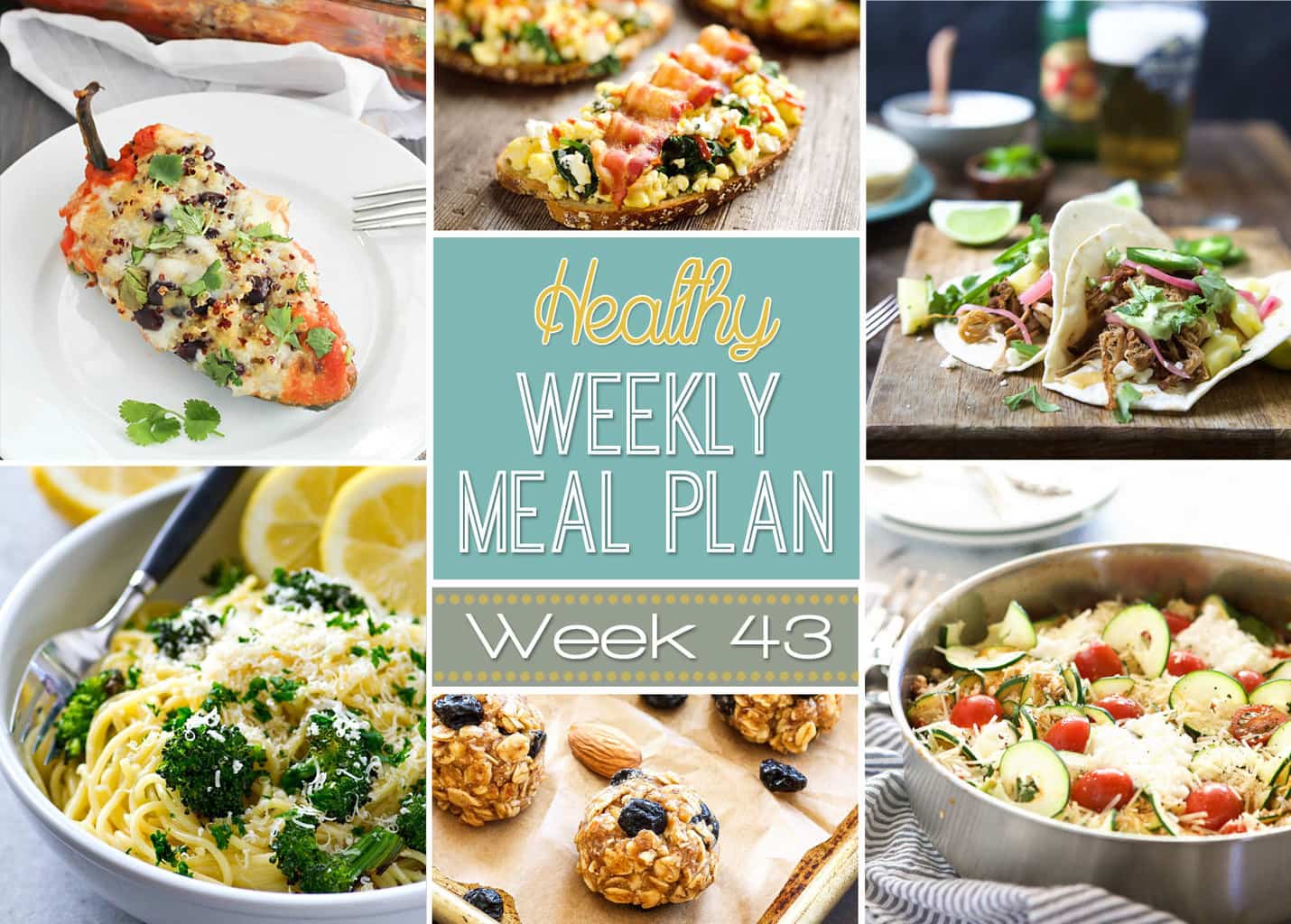 Healthy Weekly Meal Plan #43 is packed full of healthy dinners as well as a healthy lunch, snack, side dish and dessert, too! You won’t want to miss it – get planning!