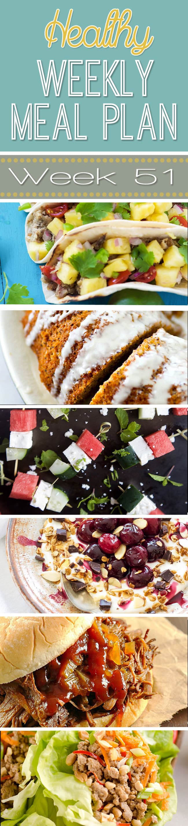 Healthy Weekly Meal Plan #51 will inspire you to eat healthy! You get a dinner idea for each night plus a lunch, snack, side dish and dessert recipe.