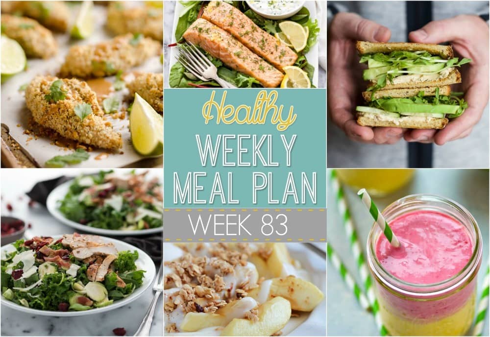 Healthy Weekly Meal Plan #83 has the yummiest of healthy dinner recipes included! There’s also a healthy breakfast, side dish, lunch and dessert recipe included, too! You will love this deliciously healthy menu plan!