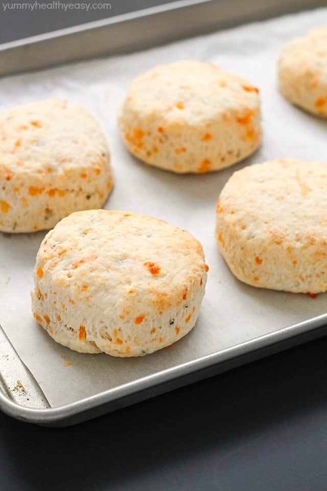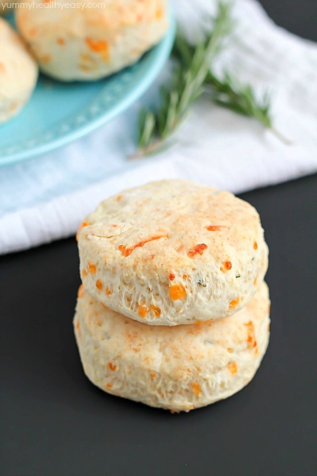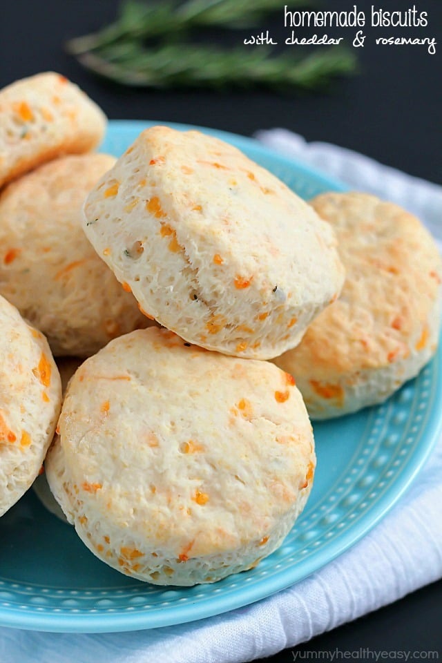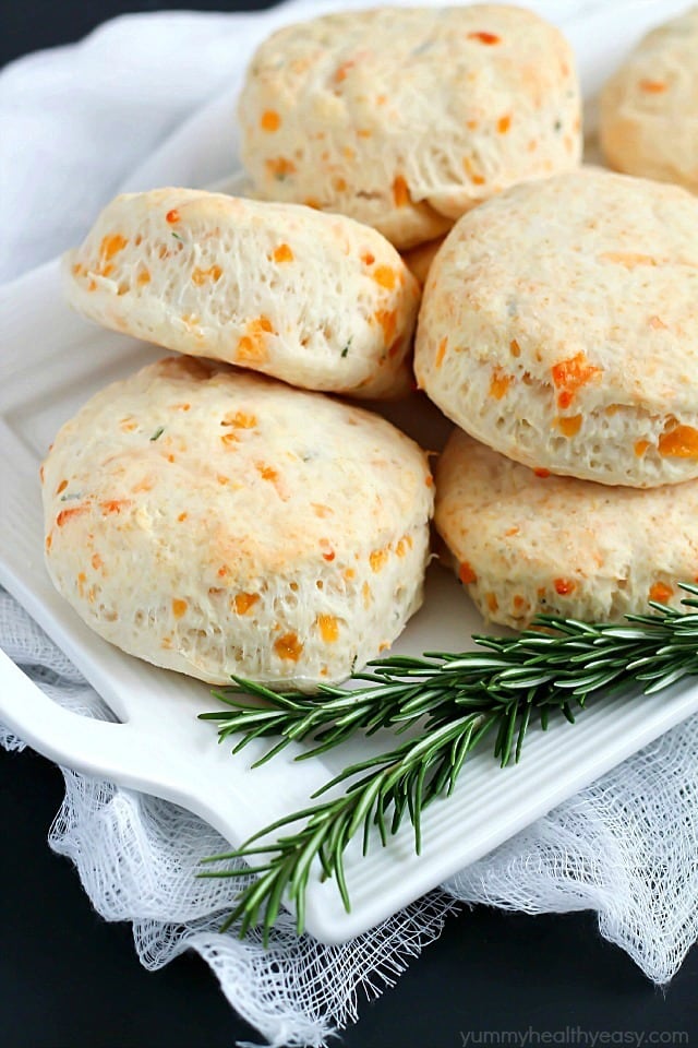 So instead of completely getting rid of carbs, I’m embracing them BUT making them a little healthier. So today, I give you these homemade biscuits. Instead of using a whole cube of butter, they have only 4 tablespoons plus some yogurt for moistness. They’re chock full of cheddar cheese and rosemary. I heart rosemary.