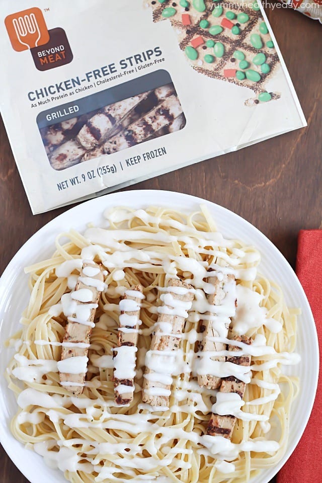 - To serve, place pasta on a plate, top with BeyondMeat Chicken-Free Strips and drizzle with light alfredo sauce. Serve and enjoy!