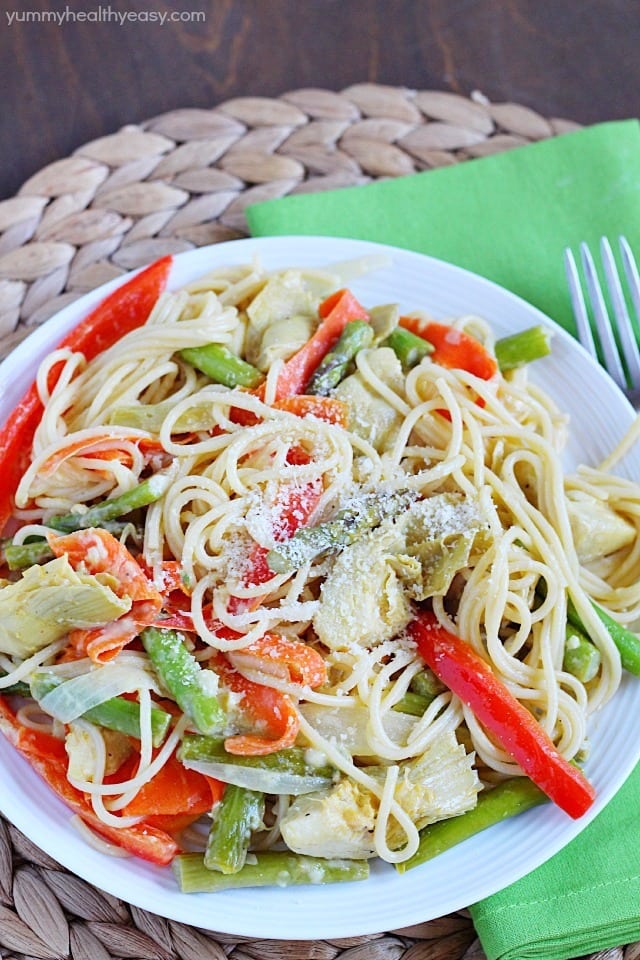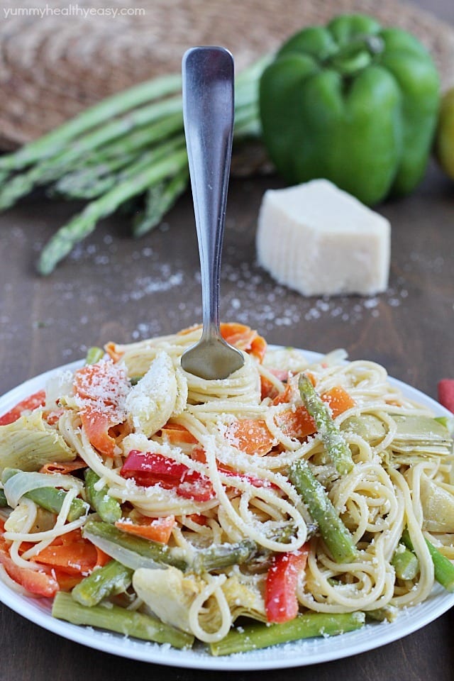 Pasta Primavera lightened up and filled with veggies for a healthy and light meatless dinner!
