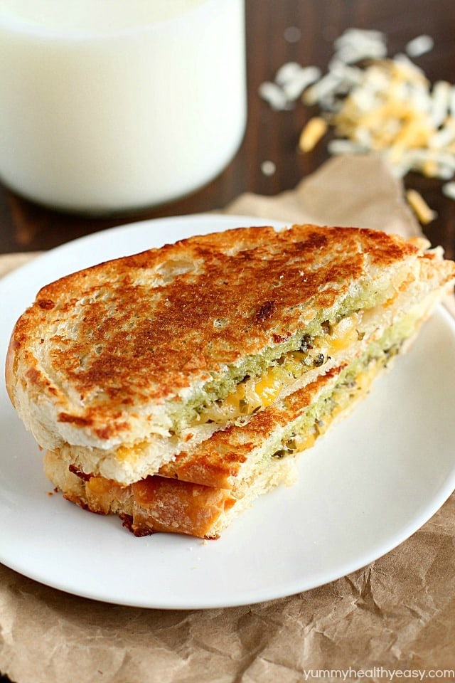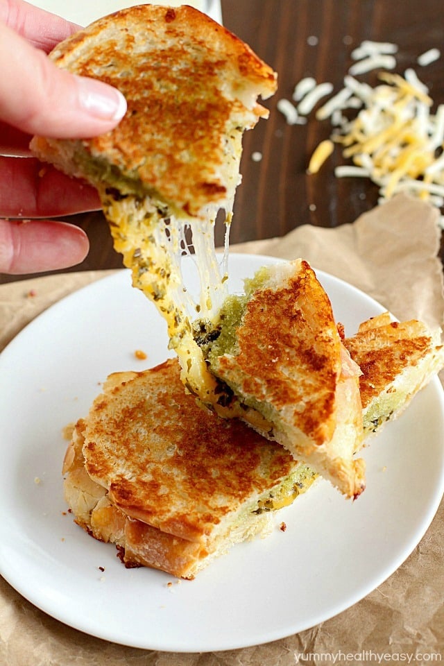What’s not to love though? Crispy, golden, buttery exterior with ooey, gooey cheese melted inside? YUM. But why don’t we kick it up a notch and add pesto? (My homemade pesto version is the bomb!) I think this makes the classic a little more adult, don’t you think? Also, pesto is green so that means it’s healthy right?? 😉