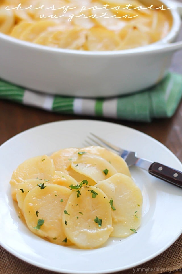 Potatoes au Gratin made with a homemade creamy cheese sauce drizzled over thinly sliced potatoes and a layer of onions nestled in the middle. Plus a full blog hop Thanksgiving menu below to help plan your turkey day meal!