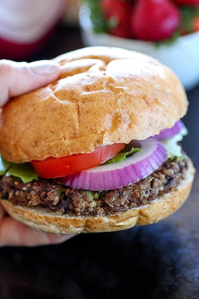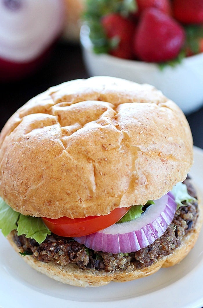 Quinoa Black Bean Burgers – meatless patties full of black beans, quinoa and spices. You won’t believe these are vegetarian! The flavor is so delicious!