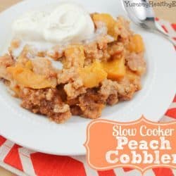 I LOVE fruit cobblers! This peach cobbler recipe is one of my very favorites. It’s slow cooked right in the crock pot and has few ingredients, making it a super simple and easy dessert! I like to use fresh peaches in the summertime but it’s also great with canned peaches. It’s amazing when served with a couple scoops of vanilla ice cream or frozen yogurt, yum!