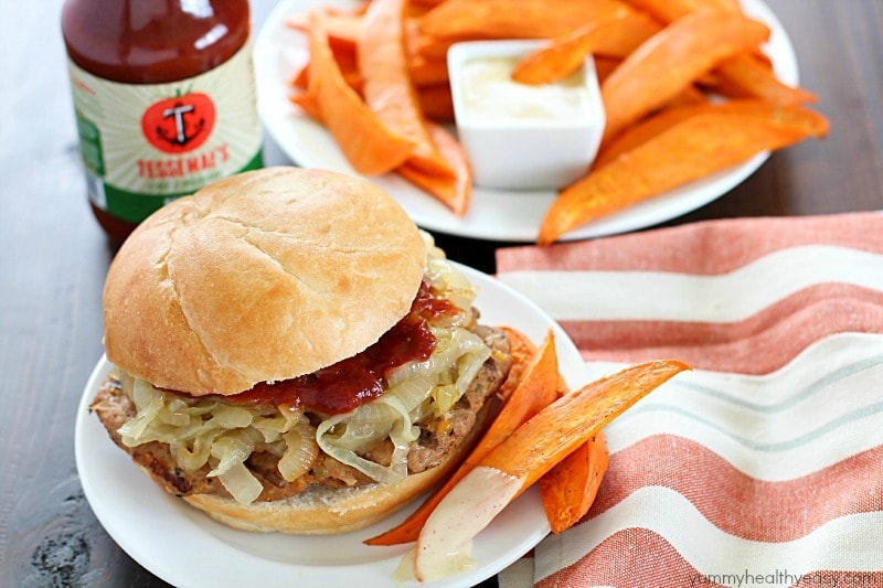 Get ready for the most flavorful spicy turkey burgers with a slathering of caramelized onions on top! Serve with a side of oven baked sweet potato fries (wedges) dipped in a spicy mayo sauce – absolutely divine! (This is a sponsored conversation written by me on behalf of Tessemae’s. The opinions and text are all mine.)