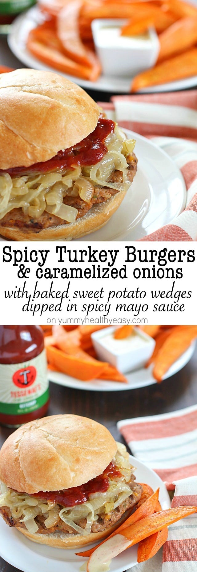 Spicy Turkey Burgers with Caramelized Onions & Sweet Potato Fries with Spicy Mayo Dipping Sauce