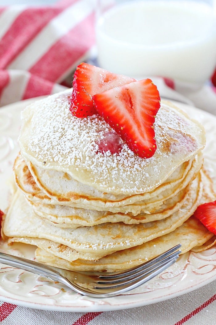 Okay, so I have to admit that I was planning on sharing this Strawberry Pancakes recipe on Valentine’s Day but things got crazy around my house and I didn’t finish on time. I think yet again, I’ve taken on too much in life. I need to learn to say no a whole lot more! (I always say this and never do it, ha!)