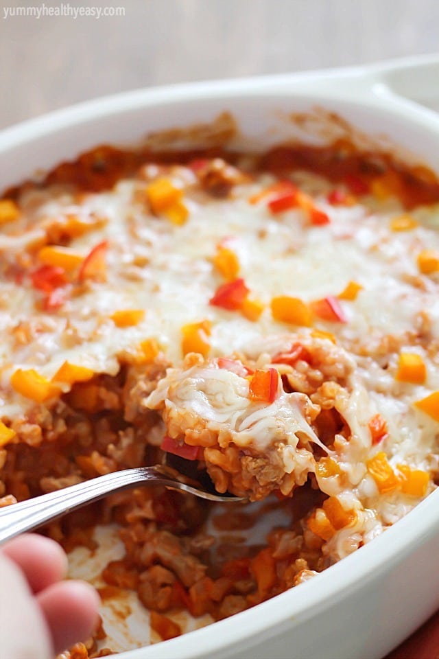 My mom’s stuffed bell pepper recipe was morphed into this stuffed pepper casserole. Leaving behind the bulk of bell peppers and cooking them until softened along with garlic, onion, ground turkey and spices. Oh, and rice of course!