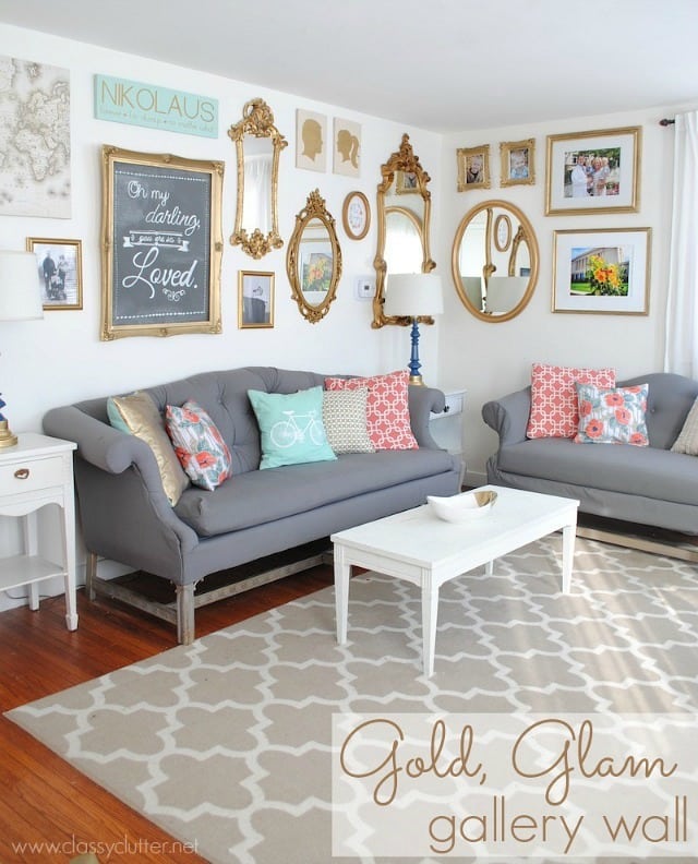 So lots of research has been done on gallery walls. Lots of time on my sister-in-law’s amazing site, Classy Clutter. I love her Gold Gallery Wall! Plus they have some printables here you can print off and put in frames to complete your gallery look. Totally what I need. If you haven’t checked out Classy Clutter – hurry over. Mallory and Savannah are so talented!