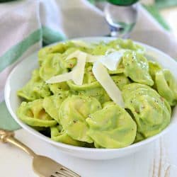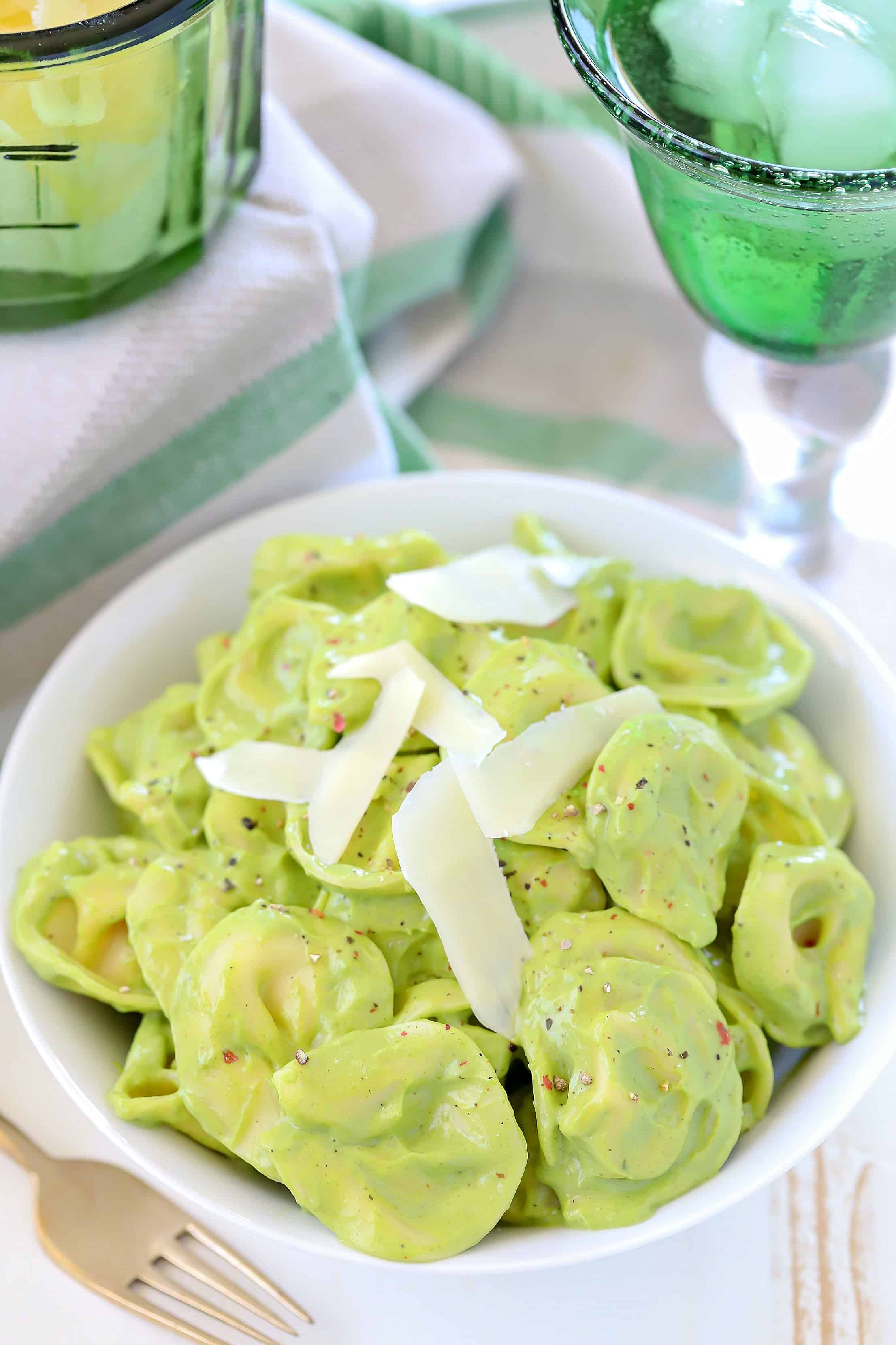 Seriously, just look at that gorgeous creamy green color. What’s not to love?! We happen to love tortellini but this sauce works great with any pasta.
