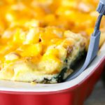 Transfer half of the bread mixture to the sprayed baking dish. Spread evenly over the bottom and press mixture down a bit. Top with half of the grated Cheddar cheese. Add cooked bacon, sausae, wilted spinach and caramelized onions in an even layer.