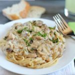 A delicious chicken and mushroom mixture served over spaghetti. It's creamy and easy as can be!
