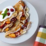 Cook for an additional 30 seconds and serve warm with your favorite toppings! This recipe makes tons of crepes! I like to serve them with cut up fruit, fruit jam and whipped topping and my kids like cinnamon and sugar sprinkled inside and then rolled up (as below). There are tons of ways to enjoy these!