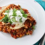 Repeat the layers TWO more times and then top with 2 tortillas. Cover and cook on LOW 6-8 hours. Scoop out onto plates and serve with sour cream and chopped cilantro. ENJOY!!